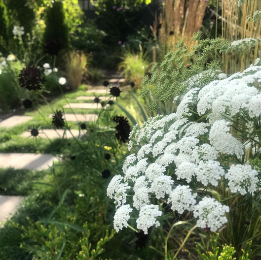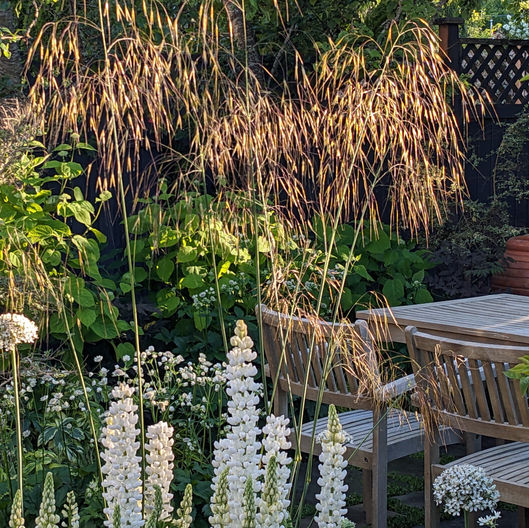 By merging formal structure with exuberant plantings, the space is divided into several areas, including a rustic bluestone patio totally surrounded by plants in a white palette, a potager area separated by a grass border, and a more casual sitting area at the back. Straight lines allow to create vistas and strong focal points, and are softened by abundant, relaxed plantings. The result is a plant-driven timeless garden that suits the Oak Bay character home.
